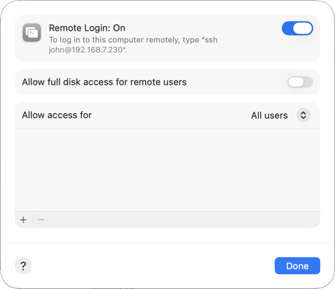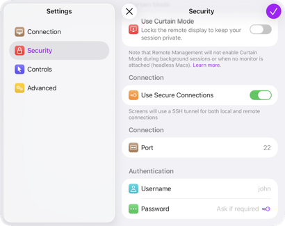 Sichere Verbindungen nutzen die macOS-Remoteanmeldung (SSH), die sich über den Kontonamen authentifiziert. Die Verwendung Ihres vollständigen Namens führt in diesem Fall zu einem Authentifizierungsfehler.